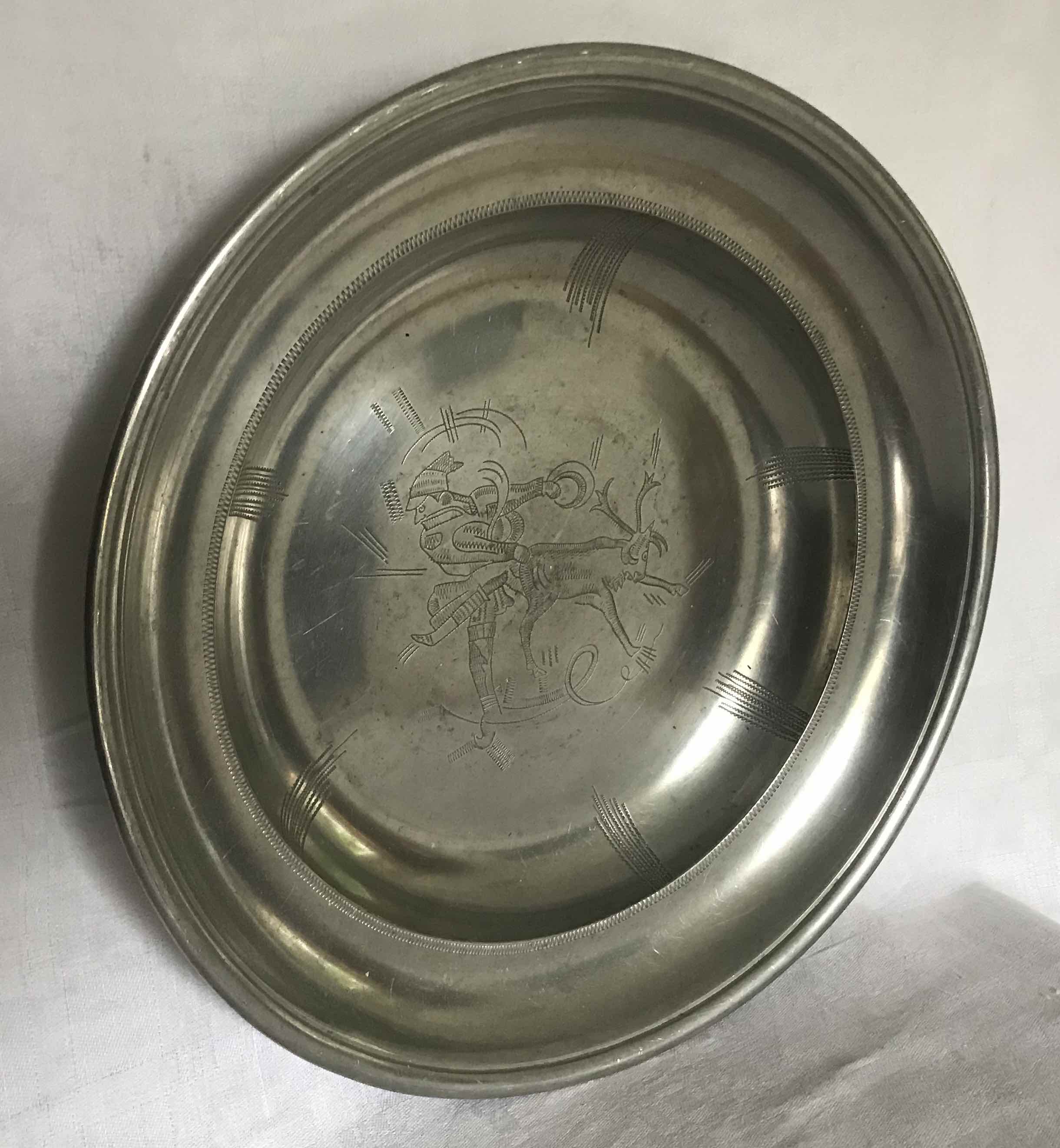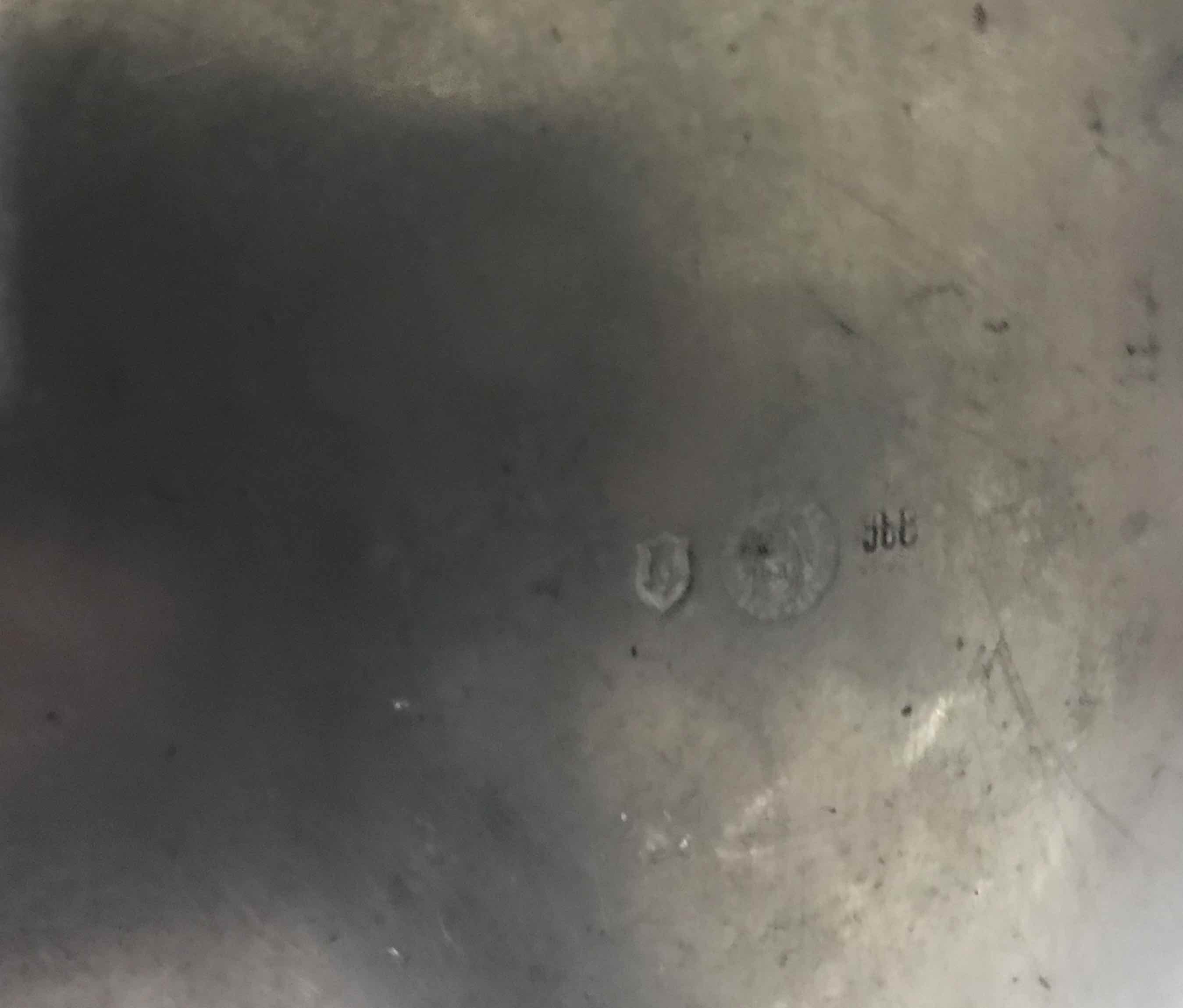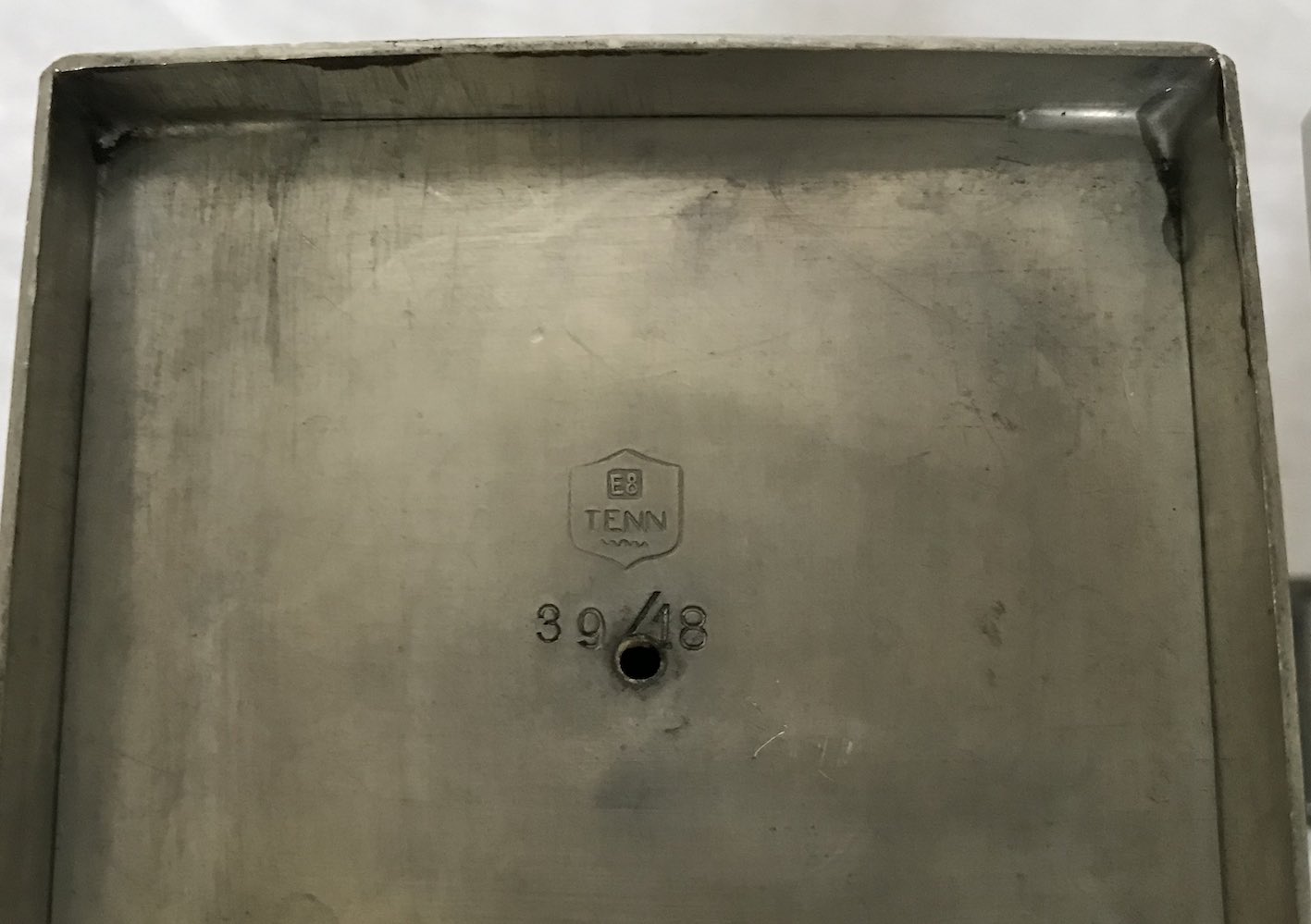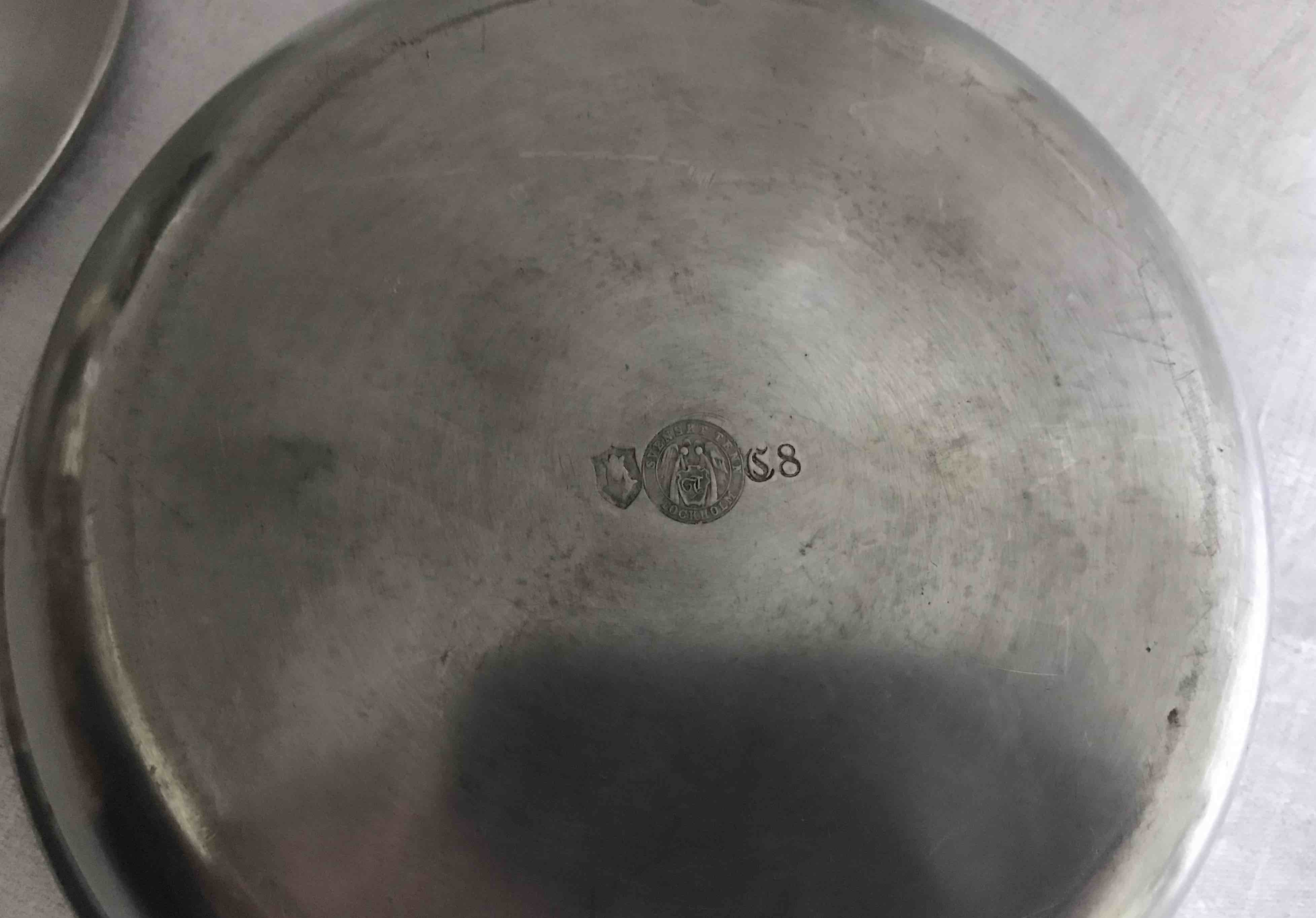 Skick: Mkt fina. Stämplat tenn i en vapenskjöld, även stämplade 39/18.
